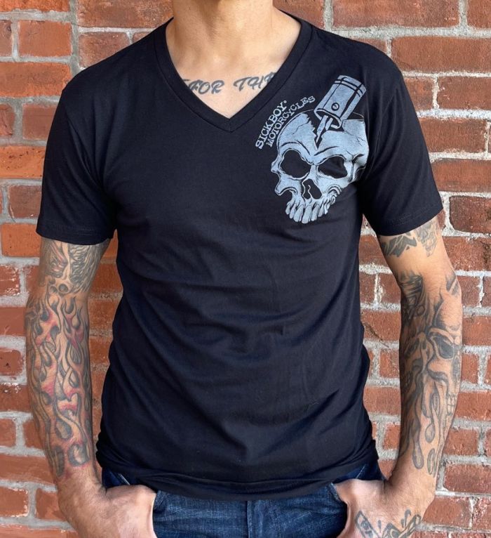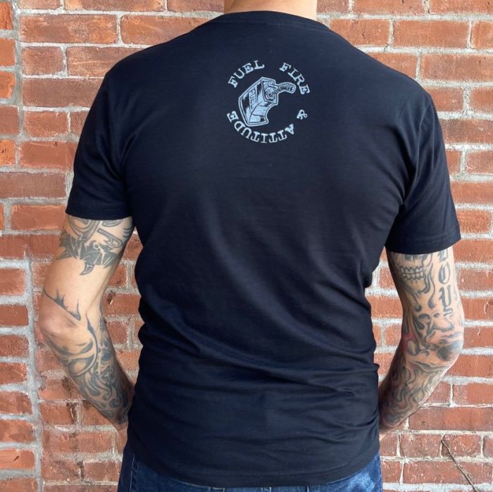 Black fuel Fire V-neck tee. These "specialty" tee shirts are not the same fit or feel as our regular t-shirts. This shirt is a lighter weight, slim fitting shirt.