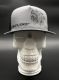 Charcoal Indian curved bill snapback hat. Embroidery and screen print on the front, mesh back with plastic adjustable closure.
