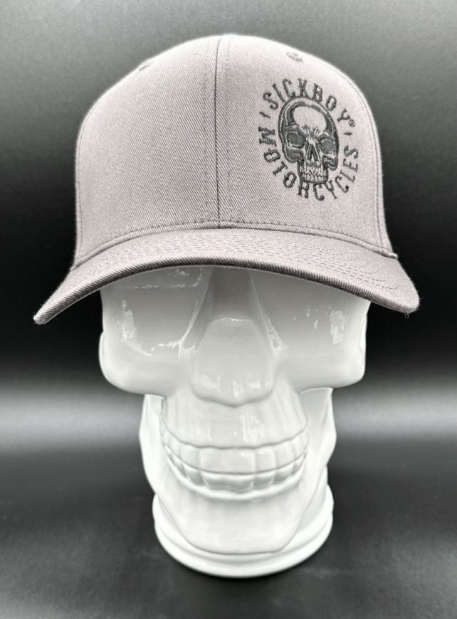 Charcoal grey curved sick boy black skull fitted hat. Embroidered front and back on a "Flex Fit" brand fitted hat. S/M fits 6 3/4" -- 7 1/4"