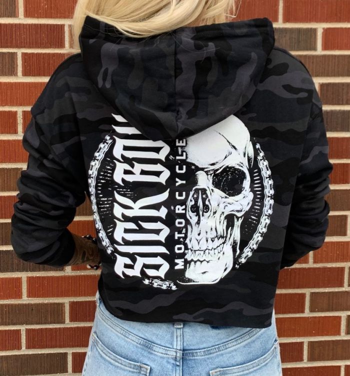 Ladies camo crop hoodie. Printed front and back on a pre washed 80/20 cotton poly sweatshirt. This crop sweat comes just to the waist and has a raw bottom edge with a slightly boxy fit.