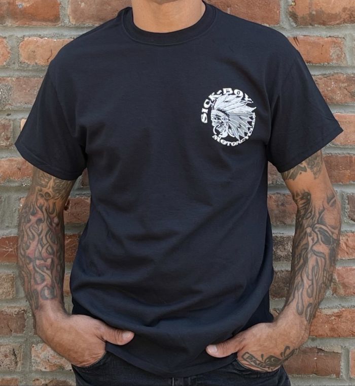 Sick Boy black Indian tee. Printed front and back on a 5.6oz 100% cotton t-shirt.