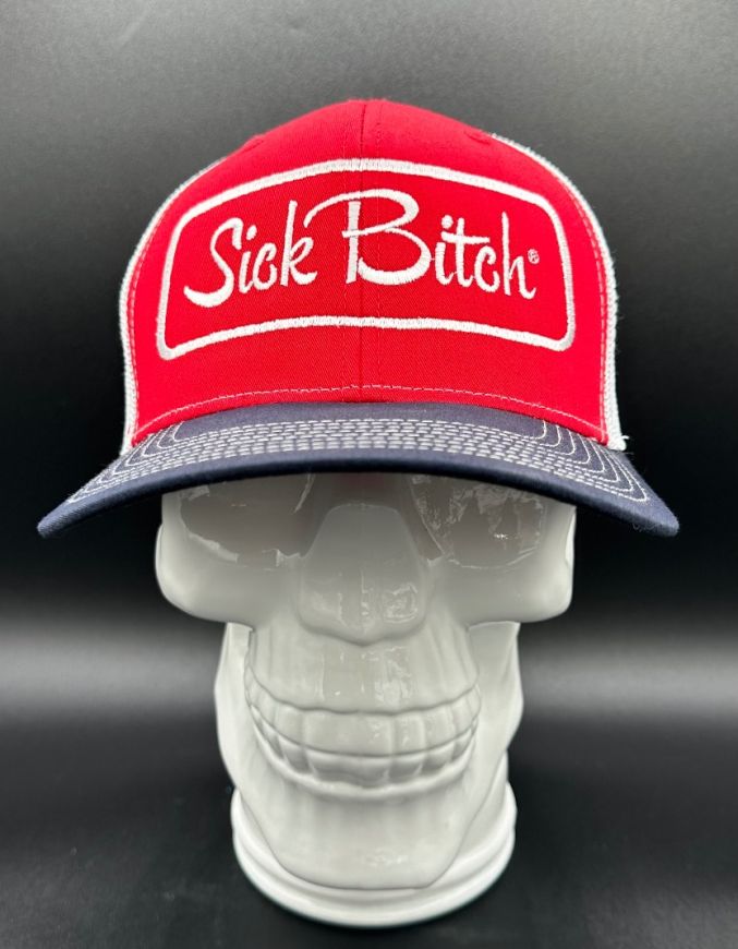 Sick Bitch Navy/Red Trucker Style Snapback. Embroidered front only on a "Richardson" brand snapback hat.