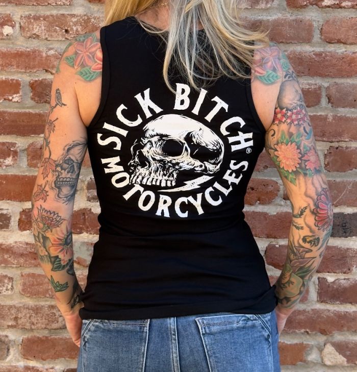 Ladies black Sick Bitch bolt tank.