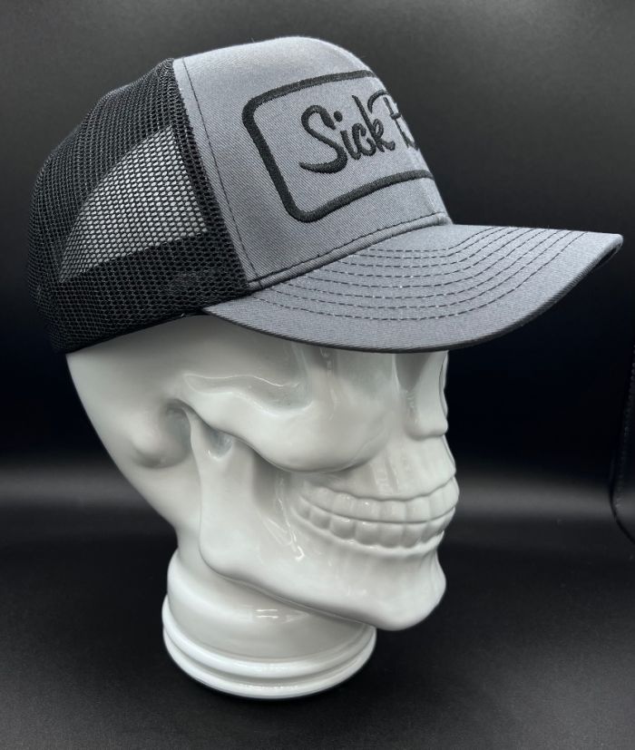 Sick Bitch charcoal and black curved snapback. Embroidered front, mesh back, adjustable closure