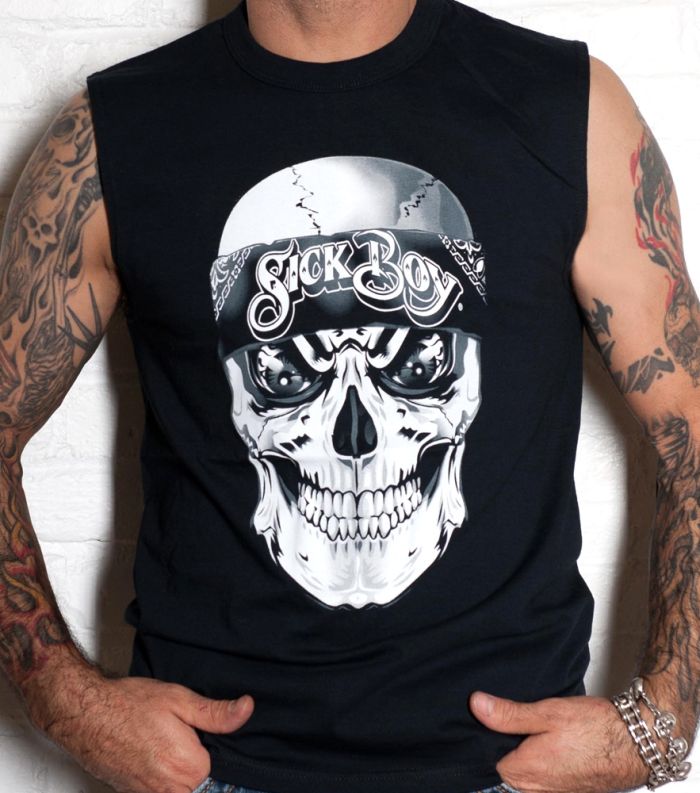 Sick Boy Motorcycles black sleeveless t-shirt with skull and black bandana print on the front, and Sick Boy "Ride Fast, Ride Hard or Ride Home" print on the back. This shirt is made of 100% pre-shrunk cotton.