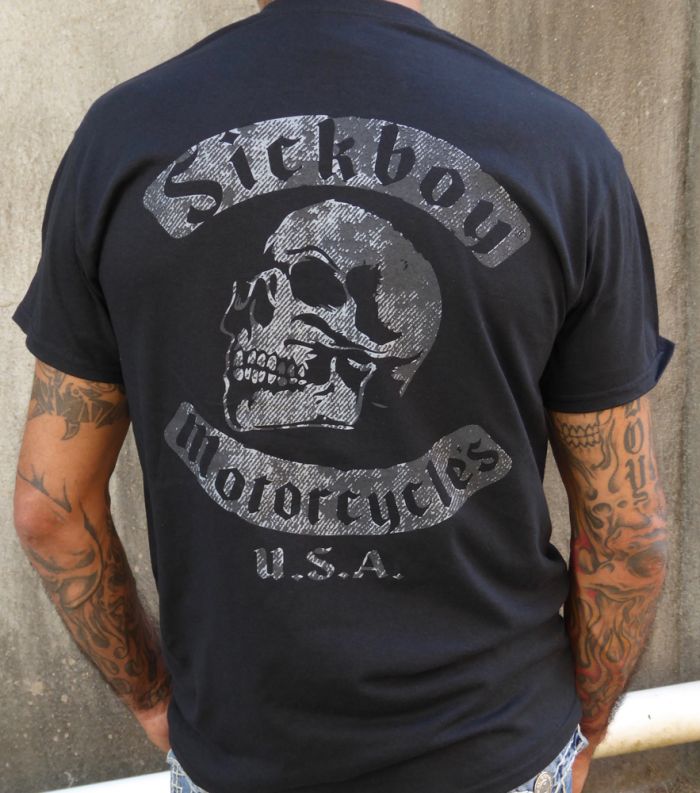 Sick Boy Motorcycles Black Skull Rocker T-shirt. 100% Pre Shrunk Tee.