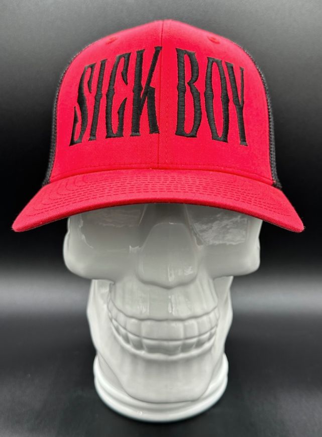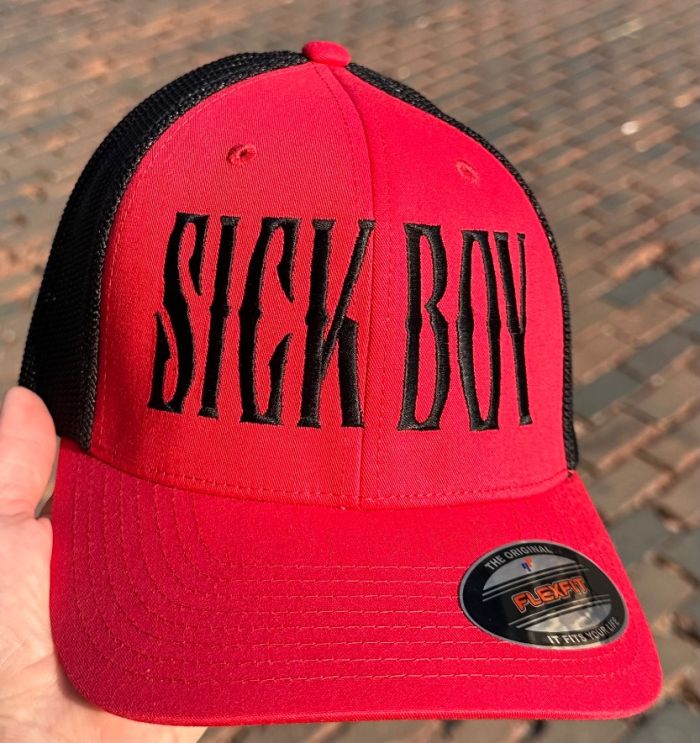 Sick Boy red/black one size fits all stretch mesh fitted hat. Embroidered front and back on a "Flex Fit" brand OSFA hat .