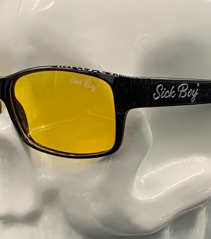 Sick Boy yellow polarized glasses have Sick Boy printed on lens and also Sick Boy raised chrome lettering on arms of the glasses. Available in yellow or dark lens. Unisex
