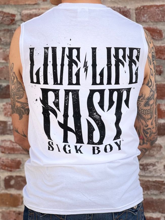 White Lightning Skull Sleeveless. Printed front and back on a 100% cotton sleeveless tee.