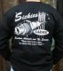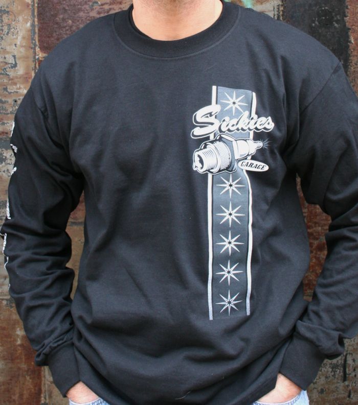 Sickies Garage black long sleeve t-shirt with "Sickies Garage Custom Attitude and No Service, Never time to do it right, always time to do it twice" print on back, "Sickies Garage" print on front and spark plugs print on the sleeve. This shirt is made of pre-shrunk cotton.