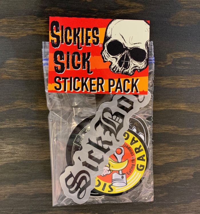 Sickies sticker pack is an assortment of 10 decals. Every pack includes 3 Sick Boy, 3 Sickies Garage, 2 Sick Bitch, and 2 Deadwood decals. We change the packs often as new stickers come in.