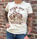 Ladies Buck Off Tee. Printed front only on a tan colored relaxed fit tee. If you want it more fitted size down. Model is wearing a Small. 50/50 Poly cotton blend.